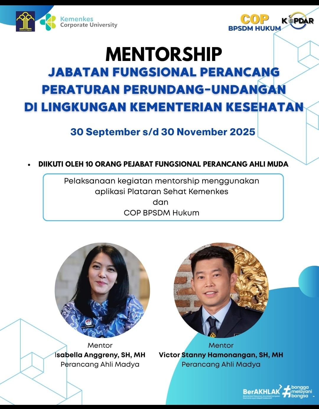 Selasa, 30 September 2025 sd November 2025 yang akan datang, dilakukan mentoring kepada pejabat fungsional Perancang Peraturan Perundang undangan Ahli Muda diingkungan @kementeriankesehatan.