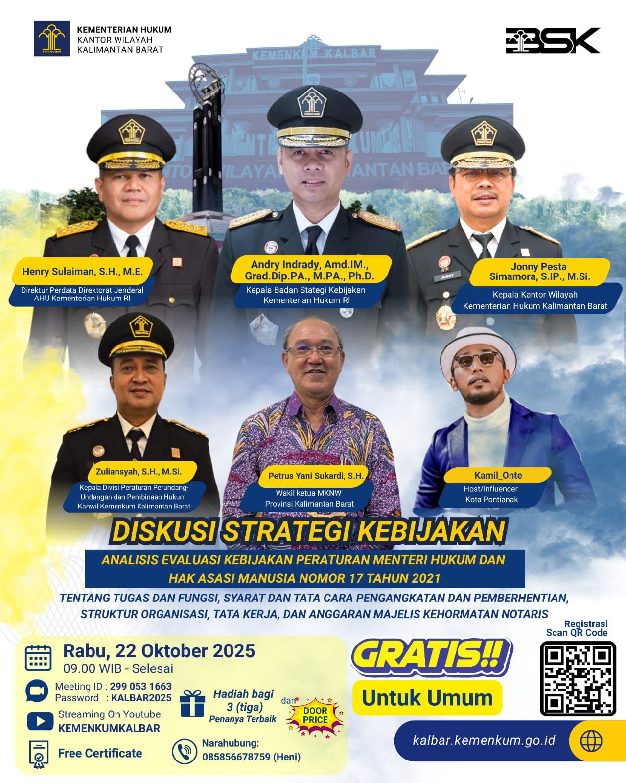Kantor Wilayah Kementerian Hukum Kalimantan Barat mengundang Bapak/Ibu/Saudara/i untuk berpartisipasi dalam Diskusi Strategi Kebijakan dengan topik: